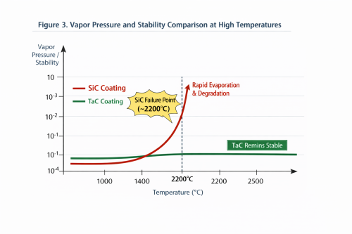 Uovertruffen termodynamisk stabilitet: Tantalkarbid (TaC) har et svimlende smeltepunkt på 3880 °C. I følge forskning i Journal of Crystal Growth gjennomgår SiC-belegg "inkongruent fordampning" over 2200 °C - der silisium sublimeres raskere enn karbon, noe som fører til strukturell nedbrytning og partikkelforurensning. I kontrast er TaCs damptrykk 3 til 4størrelsesordener lavere enn SiC, og opprettholder et uberørt termisk felt for krystallvekst.