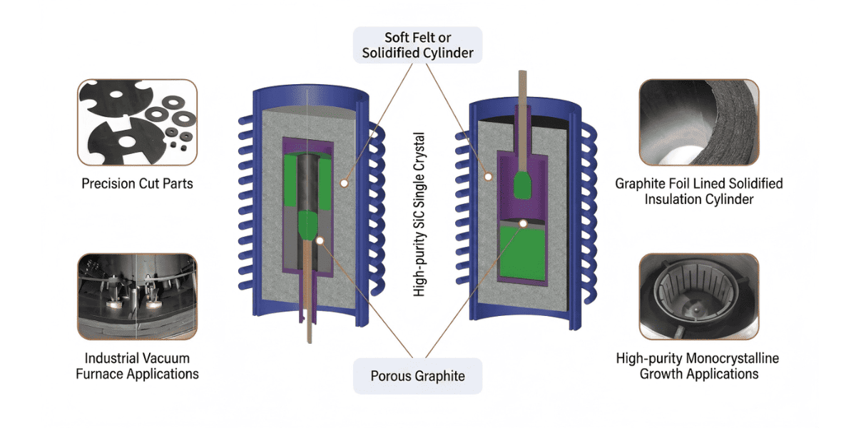Halvlederproduksjon:Dette er et nøkkelisolasjonslag for monokrystallinsk silisium og SiC-krystallvekstovnsoppsett.